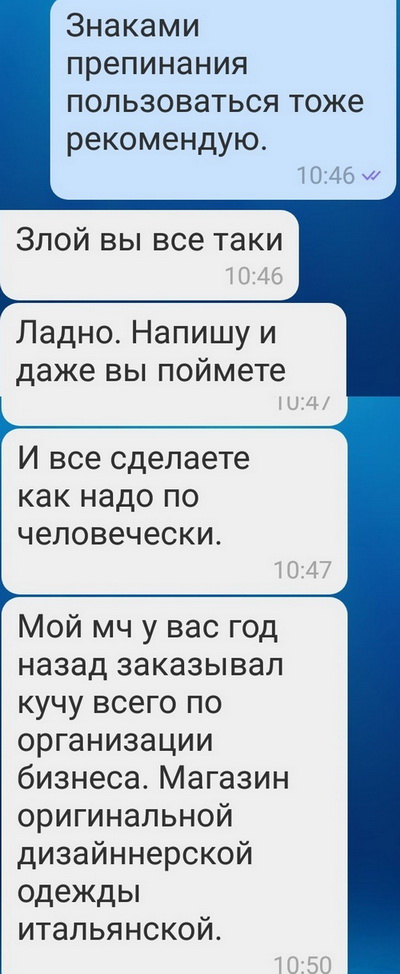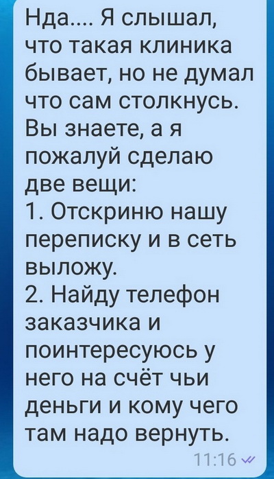 Через пару дней после этого в скайпе снова возникает эта дама и начинается уморительная переписка, похожая на ту, что приведена ниже. Дама заявляет, что после рекламы на Exler.ru было мало заказов. (Интересно, почему меня это не удивило?) И что раз реклама плохо сработала, я должен вернуть им деньги. Я давно такого дурдома не встречал, поэтому с удовольствием начал с ней переписываться, только жалко, что переписку тогда сохранить не догадался. Аргументы были примерно такие же, что у тетки на скриншотах ниже. И судами она тоже грозила. Очень я тогда веселился. (При этом у меня с ними был составлен договор, в котором были оговорены все условия, я выставлял счет и сделал акт приемки.) Но потом мне это развлечение надоело, я ее забанил в скайпе и почте и забыл о ней. Давно это было, лет семь назад. До сих пор, наверное, судятся.