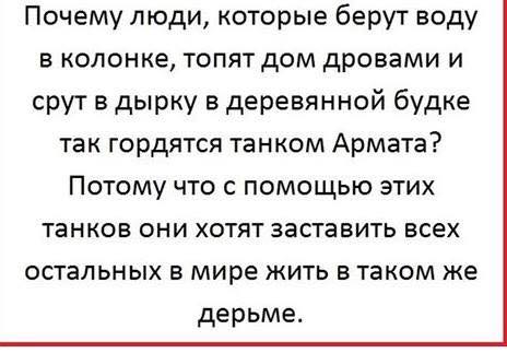 Этот товарищи пытается убедить, и не он один, и не безрезультатно, граждан России в том что Россия воюет именно затем что бы девочка Оля могла выбрать свои трусики сама, а не под руководством ЕС и США. Об этом вещают российские пропагандисты, и это, к сожалению, хорошо ложится на почку серости и узости мышления российского обывателя.