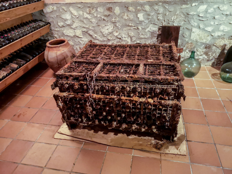 Одну из марок вина этого хозяйства выдерживают в бутылках в море, для чего их помещают вот в такие железные клетки.