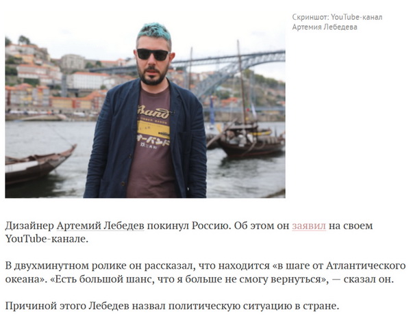 Главная новость дня - Тема Лебедев отмочил очередную "шутку" в своей обычной дебильной манере. Пошутил - и поехал в Москву снова Собянину зад целовать за новые заказы. И это в тот момент, когда люди сидят в тюрьмах и заводятся уголовные дела по липовым обвинениям. До какого же убожества доходят некоторые люди - это просто удивительно...