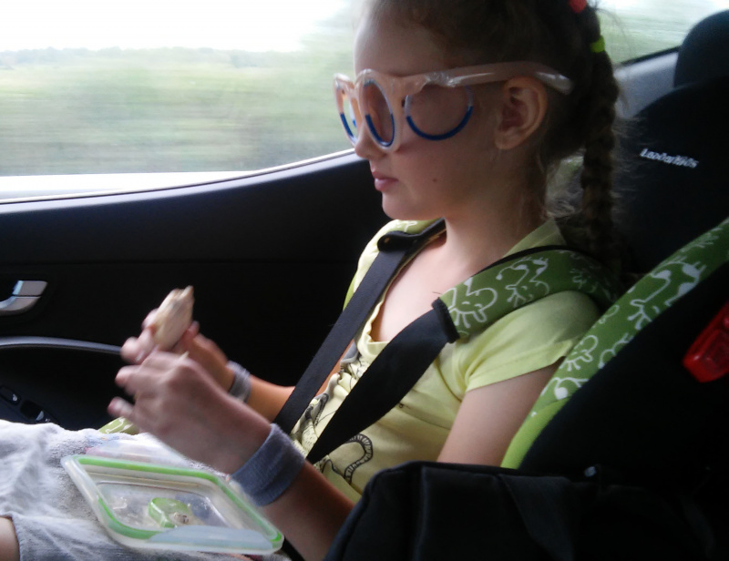 Мою младшую дочь всегда сильно укачивало. Пробовали разные препараты, браслеты — эффект слабый. Этим летом нам предстояло ехать с родственниками на машине из Москвы в Киев. Как-то в интернете наткнулся на статью об очках от укачивания. Покупать дорого и времени не оставалось. Сделали с тестем сами. Из обычной оправы и трубочек. :) Прилагаю фото, как это выглядело. Сработало на 100%! Никакого укачивания не было и в помине. Отлично доехали.