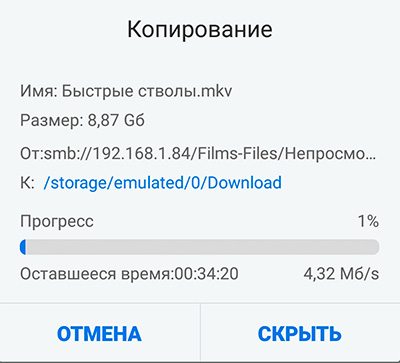 То есть ожидаемая скорость перекачки из локальной сети - где-то 5-7 мегабайт в секунду. Качаю - да, от 4 до 5 мегабайт, то есть вполне похоже на ожидаемые показатели. И FullHD воспроизводится нормально и без тормозов.