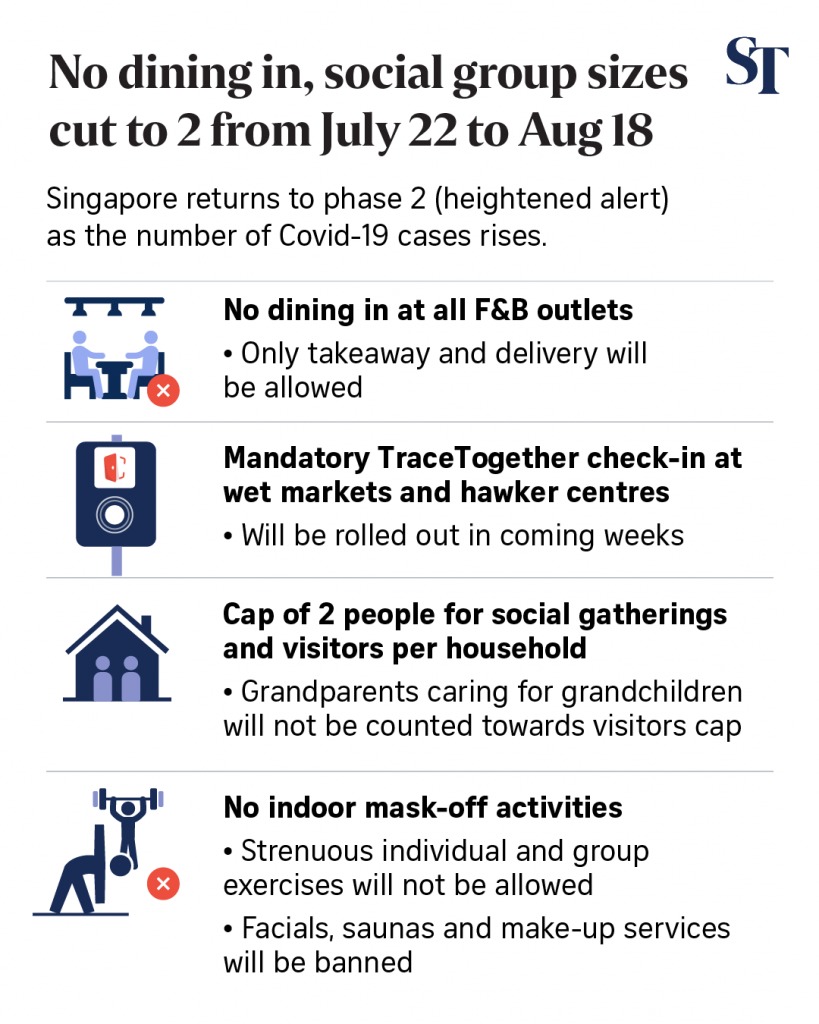 This, and other tightened measures for higher-risk indoor, mask-off settings will be in effect from Jul 19 to Aug 8.