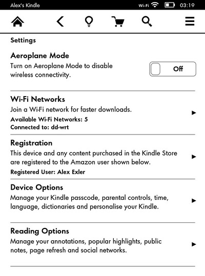 Настройки у Kindle традиционно бедноватые, интересного там мало. Ридер можно блокировать паролем, включать родительский контроль (браузер, магазин и облако), устанавливать дополнительную клавиатуру (кириллица не поддерживается), задавать полное обновление страницы при каждом перелистывании, подключать аккаунты твиттера и Facebook, чтобы постить туда свои заметки.