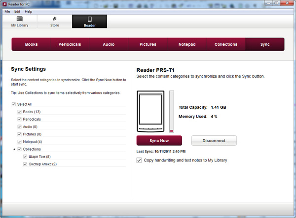 Закачанные и купленные книги потом автоматически заливаются на подключенный ридер при синхронизации.