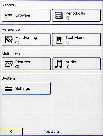 На следующей странице - еще семь кнопок: браузер, периодика, рисование, заметки, картинки, аудио, настройки.