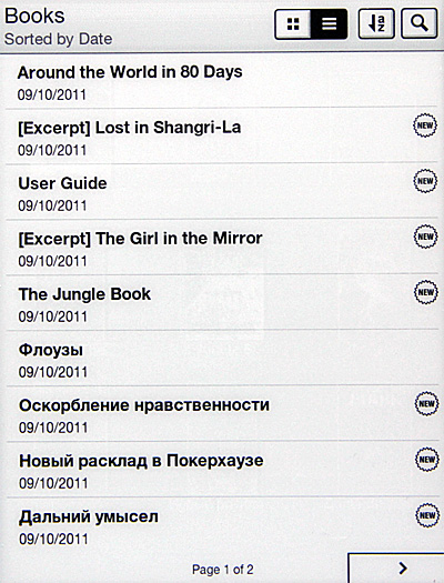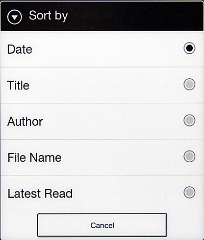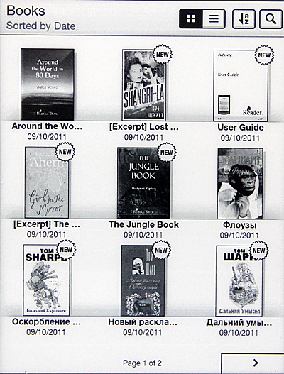 Доступны различные виды сортировки: по дате закачки, названию, автору, имени файла и последние прочитанные.