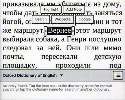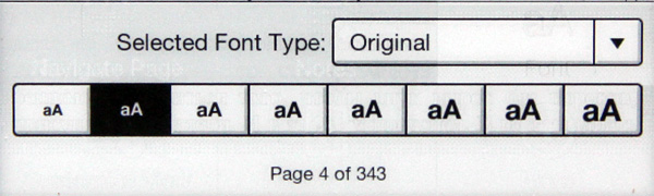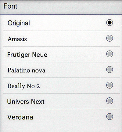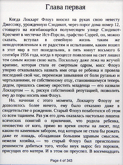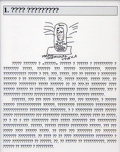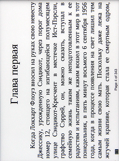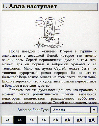 Кстати, настройка гарнитуры, хоть ее и нечасто используют, в некоторых случаях может пригодиться. Когда ридер не знает оригинальный шрифт книги Epub, он его выводит вот так. (Подобный случай, впрочем, произошел только с теми книгами, которые я конвертировал сам из HTML.)