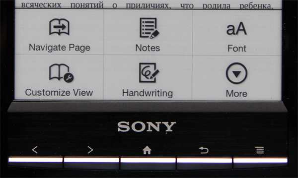 Клавиши управления традиционно располагаются под дисплеем, и они почти такие же, как у моделей PRS-650 и 350, однако кнопка изменения размера шрифта заменена на "возврат" - кстати, это более актуально, правильное решение.
