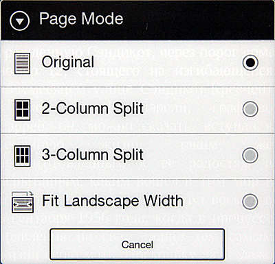 У страничного режима есть четыре вида: оригинальный (то есть как есть), разделенный двухколоночный, разделенный трехколоночный, поместить в альбомный режим.