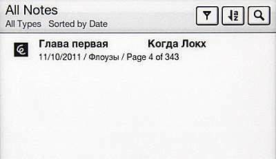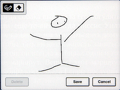 Я вообще ожидал, что тут, как в PRS-650 и 350, будет еще и кнопка добавления закладки на страницу, но ничего подобного не обнаружилось. И в других разделах меню не обнаружилось. Тогда я подумал, что закладка должна добавляться при нажатии пальцем на правый верхний угол. Не получилось. И только потом выяснилось, что срабатывает действительно именно при нажатии пальцем на правый верхний угол, просто нужно довольно точно попасть. Тогда появляется закладка и сразу также появляется вопрос о добавлении клавиатурной или рисованной заметки. Если заметку отменить, закладка, разумеется, остается.