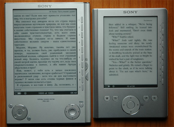 В сравнении с PRS-505 даже на фотографии видно, что у PRS-300 бумага белее.