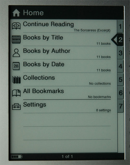 Главное меню - традиционное: продолжать чтение; сортировать книги по заголовку, автору или дате; показать коллекцию, показать все закладки и вызвать настройки.