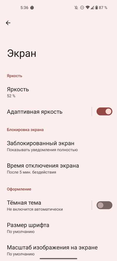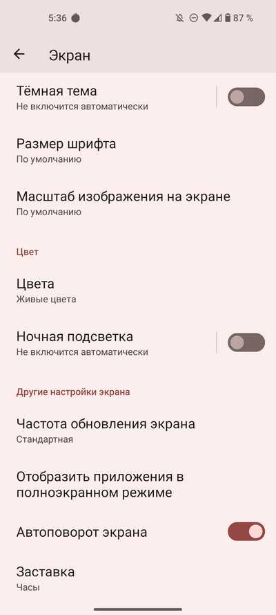 В настройках экрана можно включать темную тему, ночной режим, менять размер шрифта и масштаб, задавать частоту обновления экрана.