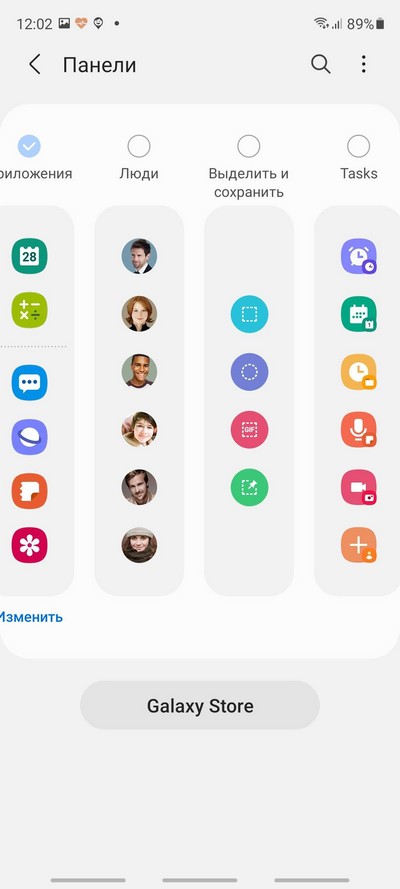 Виды панелей Edge, скачивание новых панелей из магазина Samsung.