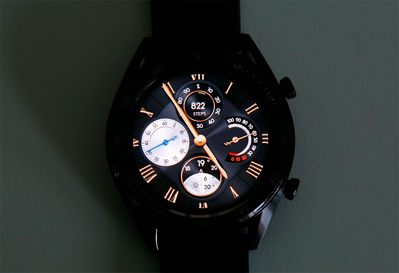 Я боялся, что AMOLED на солнце будут сильно слепнуть, но с этой матрицей явно наблюдаются серьезные подвижки, потому что у этих часов экран на солнце вполне различим. (У Huawei Watch экран на солнце слеп почти в ноль.) Не сравнить, конечно, с часами с рефлективными дисплеями, у которых на солнце дисплей виден намного лучше, чем в помещении, но для AMOLED все выглядело очень пристойно.