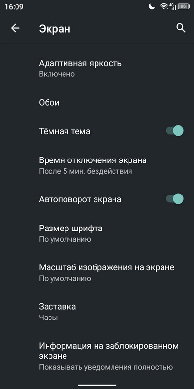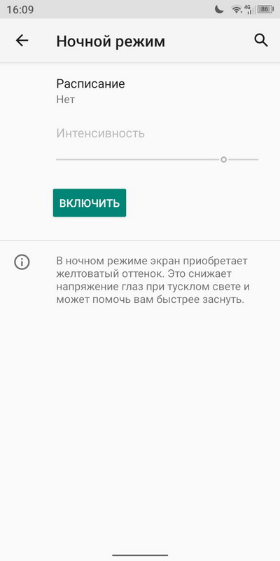 Настройки экрана здесь довольно скромные. Есть ночной режим, работающий в том числе и по расписанию, есть темная тема.