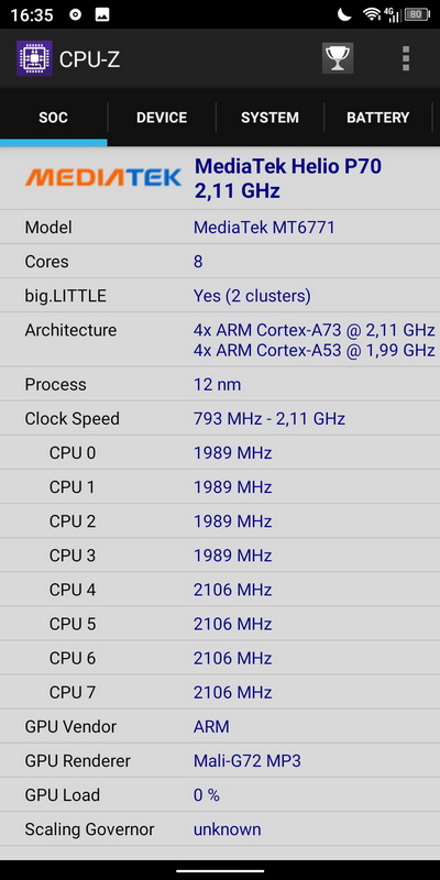 Процессор: MediaTek Helio P70, 4 ядра Cortex-A73 с частотой 2,1 ГГц, 4 ядра Cortex-A53 с частотой 2,1 ГГц, стекло Gorrila Glass 3