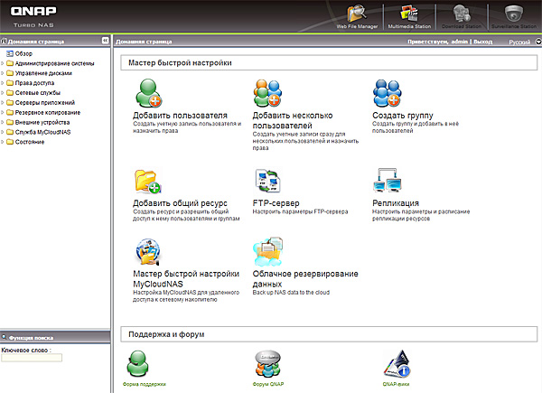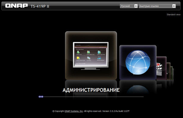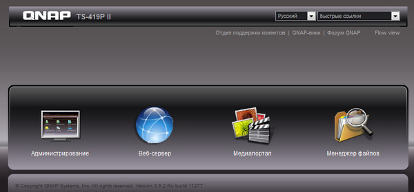 Главное окно админки выглядит вот так - там скроллируются пиктограммы: администрирование, веб-сервер, медиапортал, менеджер файлов, отдел поддержки, QNAP-вики, форум QNAP.