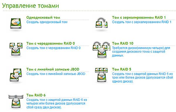 Первым делом отправляемся в раздел "Управление дисками - Управление томами", чтобы задать конфигурации для жестких дисков накопителя. Варианты там следующие.