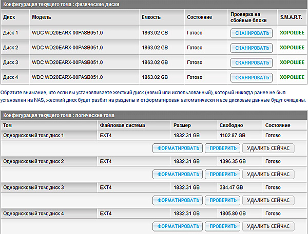 Здесь, в отличие от сервера Acer Aspire easyStore, в котором один из четырех дисков был занят под систему Windows Home Server, все четыре жестких диска используются под хранение данных. (В данном NAS, как и почти во всех других, система установлена на флеш-памяти).