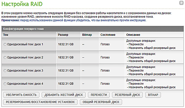 В моей ситуации я просто сделал четыре однодисковых тома - у меня разные виды данных хорошо укладываются в 2 Тб, а дублирование информации я делаю в "облаке", что хорошо поддерживается этим же NAS - мы это еще рассмотрим.