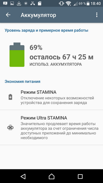 Тем не менее чисто практически обещанных производителем два дня без подзарядки смартфон не выживает при нормальном использовании. Один день живет железно даже при очень серьезной нагрузке (10 часов по PCMark - это довольно много). Два дня - только при не слишком активном использовании и с включенным режимом STAMINA.
