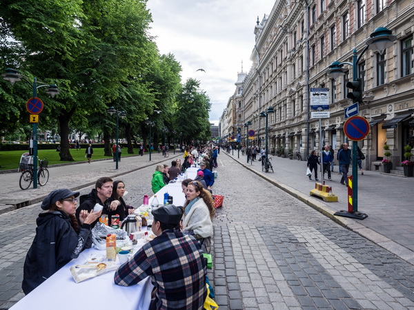 Мы как раз были в Хельсинки 12 июня - это национальный финский праздник, посвященный столице, то есть Хельсинки! На улицах было полно народу, много где играла музыка, также тут было устроено всегородское застолье: на улицах выставили длиннющую линейку столов, можно было заплатить очень небольшую денежку и попировать за столом из своих припасов. Многие этим воспользовались.