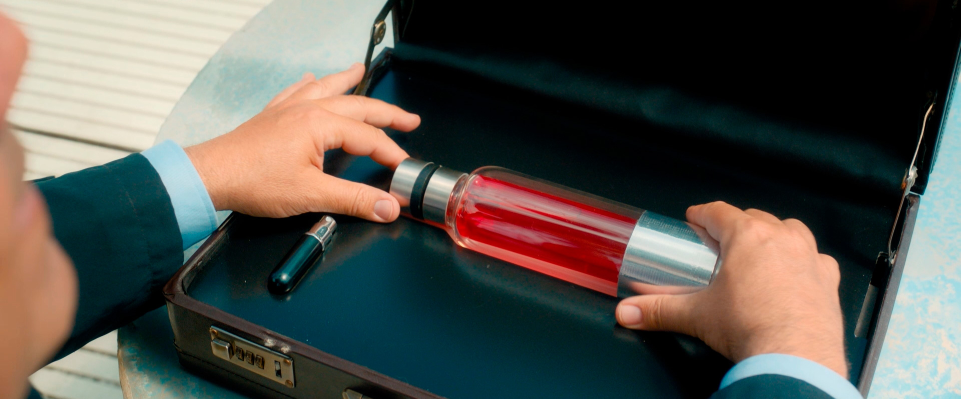 Но тут раздается взрыв - там, парарам, - какой-то крепкий мужчина похищает чемоданчик с духами и сбегает на мотоцикле.