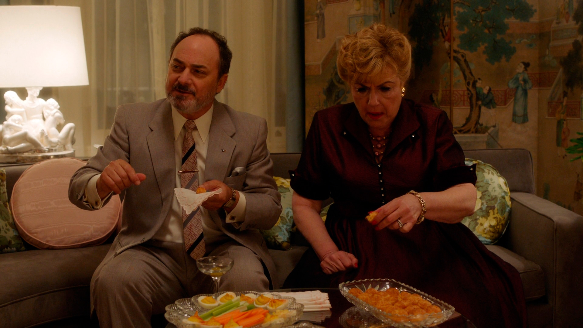 Семейные скандалы между родителями и дочерью, а также между родителями как таковыми внешне проходят довольно тихо, но внутри там разгораются нешуточные страсти. А уж взгляд бедного папы Эйба, которого, в довершение ко всем напастям, мама Роуз изгнала из его кабинета, - в нем столько невыносимых страданий, что вот прям сразу хочется вызвать взвод спецназа в поддержку папы Эйба.